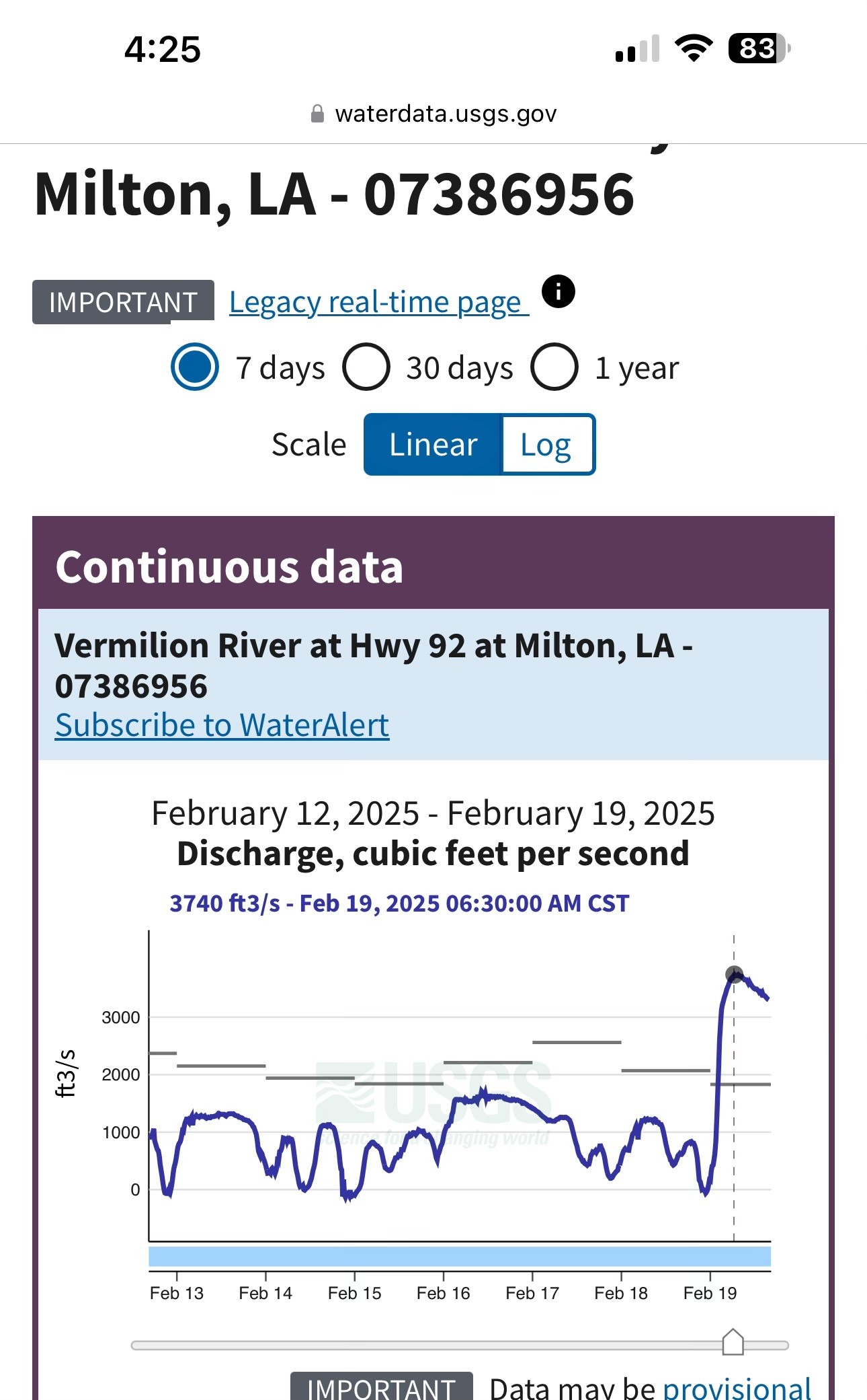 Note that Surrey was flowing south at 751CFS vs >3000CFS at Milton and Milton peaked at 3740 CFS when river crested. The Ruth Canal gate is closed so all Surrey flow is from north VR watershed minus what is coming in at the Fusilier Weir near Arnaudville.