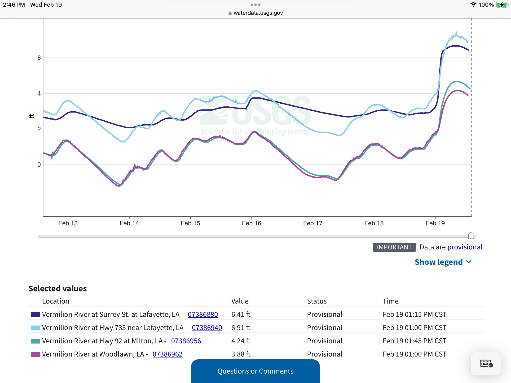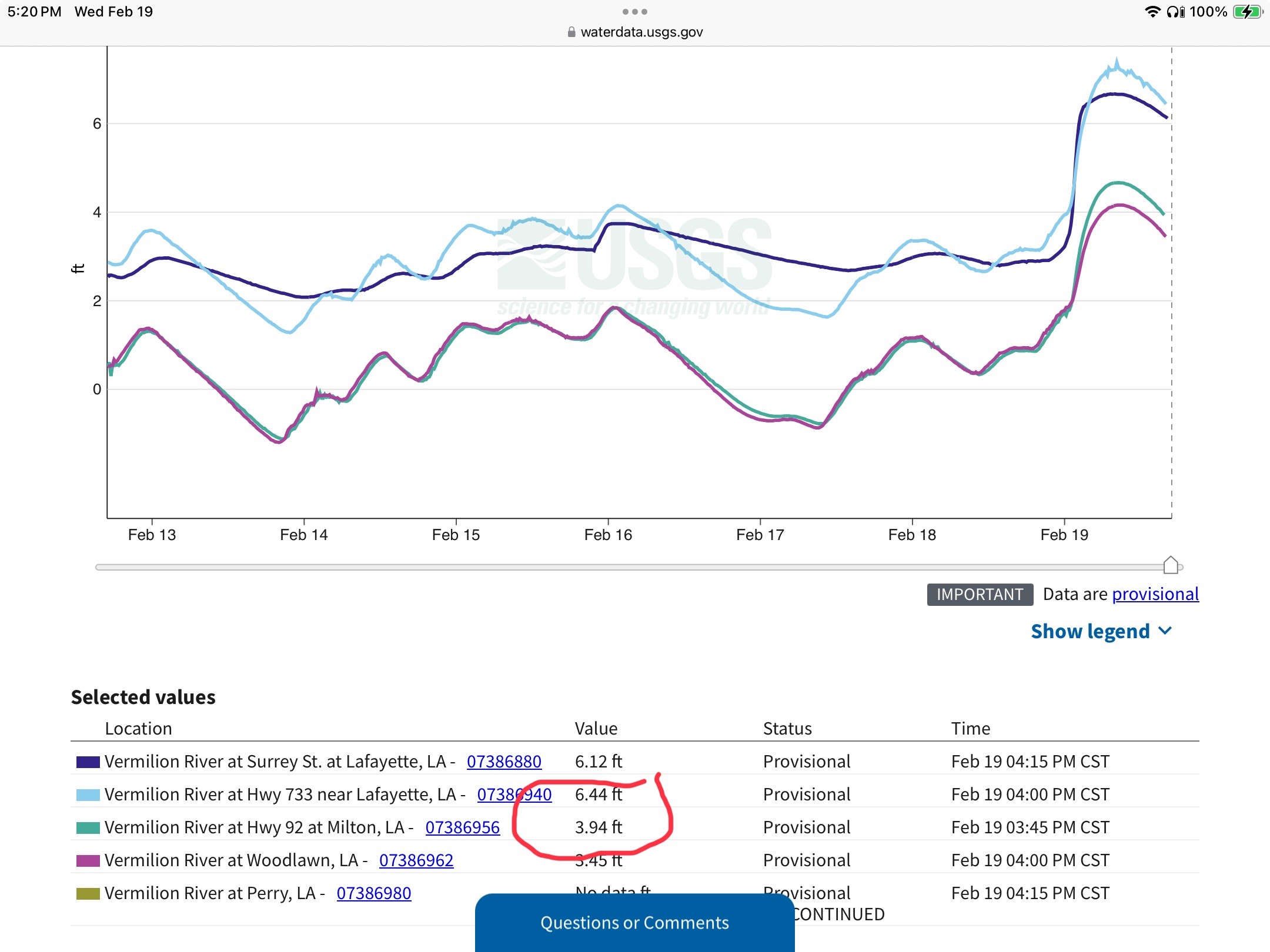 So, another look at levels along the river during this event illustrated the following that the river was measuring 2.5′ higher at E Broussard than Milton. Upon further investigation it appears that the NAVD88 Stream Level calculations for the Milton gage may be in error as this differential exists even during low water normal pool stage readings. We recommend investigating this issue See below graph.