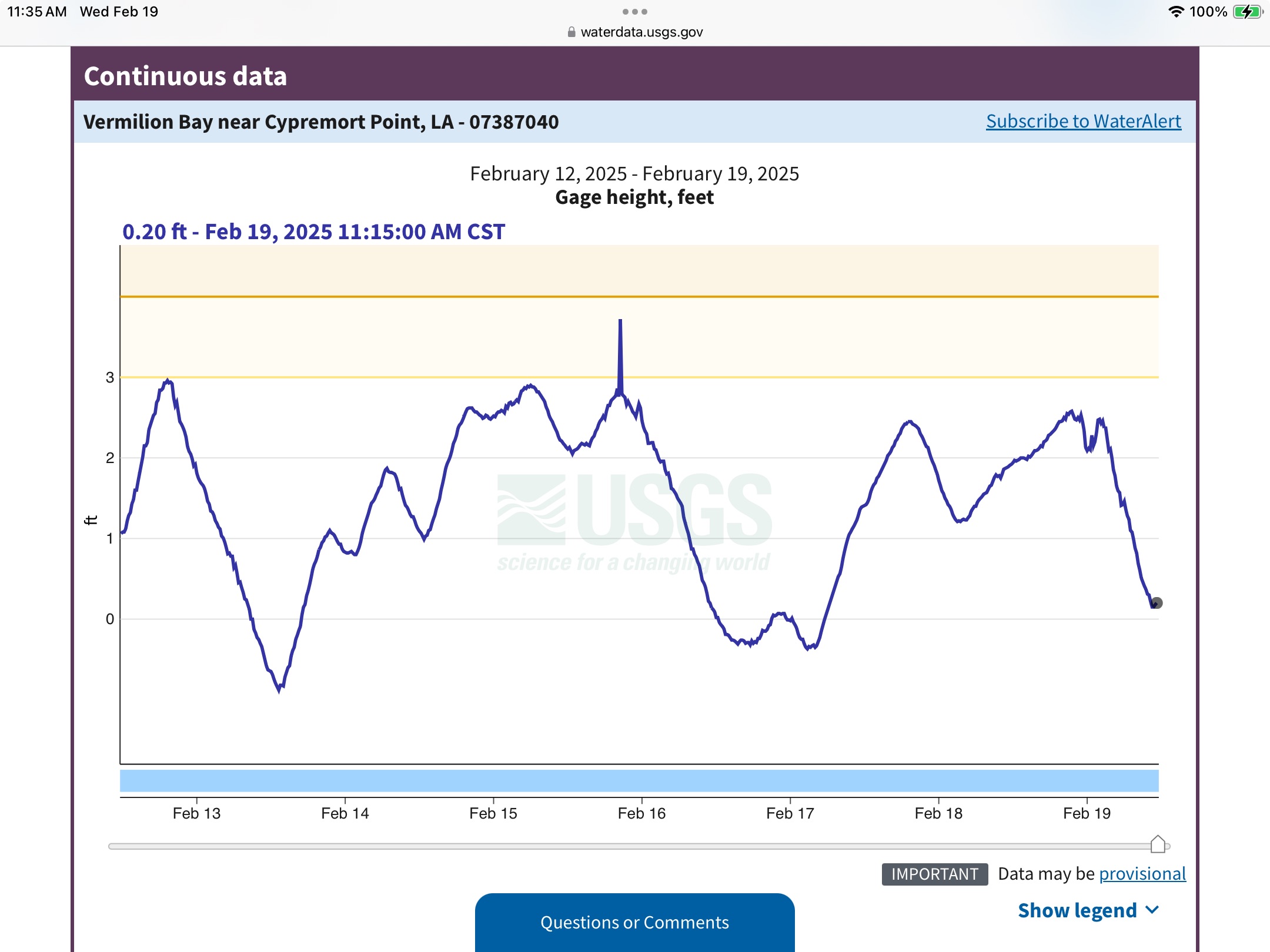 Graph of tide at Cypremort Point in Vermilion Bay 2-19-2025